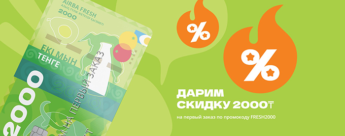 На первый заказ компания Airbafresh.kz дарит скидку 2000 тенге. Для этого нужно воспользоваться бессрочным промокодом Fresh2000. Скидка действует только в том случае, если сумма заказа превысит 5000 тенге без учета стоимости доставки. Если делаете крупный заказ, на сумму свыше 15 тысяч, можно воспользоваться аналогичным промокодом Fresh2000: он дает скидку 4000 тенге.