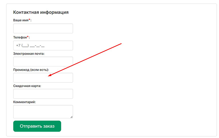 Ниже заполняются поля для добавления промокода, чтобы можно было получить скидку или бонусы по акции, и для скидочной карты, если покупатель является участником программы лояльности.