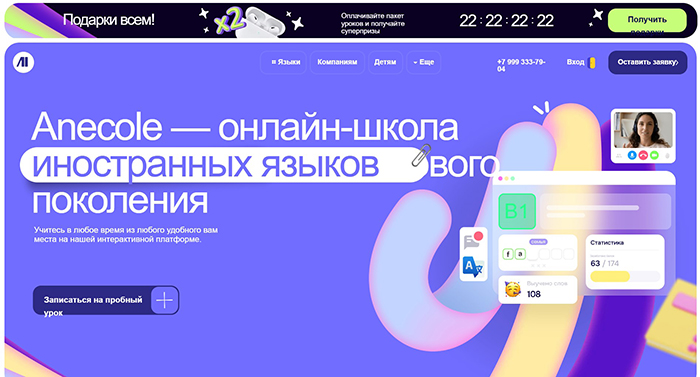 Анеколе – онлайн-школа иностранных языков. Здесь преподают английский, французский, испанский, немецкий, итальянский, португальский и китайский. Материалы подбираются с учетом возраста и текущего уровня подготовки ученика, для занятий используется собственная интерактивная платформа компании. А регулярные скидки и промокоды, которые предлагает Анеколе, позволяют неплохо сэкономить.