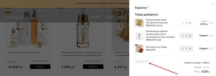 Подобрать подходящие косметические продукты на сайте можно за считаные минуты. Для этого воспользуйтесь системой поиска или же загляните в соответствующий раздел каталога. Когда вы выберете нужные товары, переходите к оформлению. Заглянуть в Корзину и даже ввести промокод на скидку, вы можете, кликнув по соответствующей иконке вверху страницы, а чтобы начать оформление, нужно нажать на кнопку «Оформить заказ».