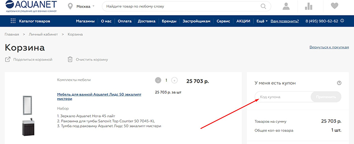 С помощью удобного каталога товаров или возможностей поисковой системы Aquanet.ru легко подобрать подходящие товары, сравнить их характеристики и определиться с тем, какой наиболее отвечает вашим целям. Выбрав нужное, не забывайте отправить товары в Корзину. Когда список покупок полностью составлен, можно переходить к оформлению. Открыв Корзину, вы можете сразу же ввести промокод. В правом блоке есть строчка «Код купона». Далее неавторизованный пользователь должен заполнить подробную анкету: