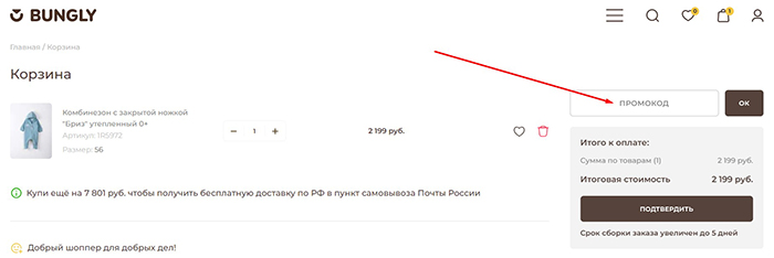 Если промокод для Bungly.ru активировался, а на заказ была насчитана скидка, можно подтвердить его и переходить к оплате. Если нет, нужно повторить все действия с самого начала. Обязательно проверьте условия активации промокода – сколько он действует, на какие товары распространяется, суммируется ли с другими скидками.