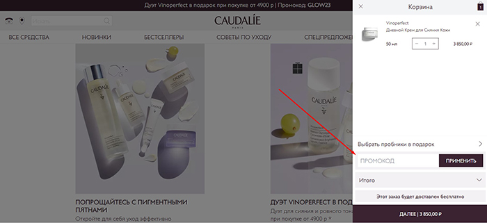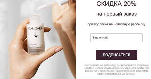 Для постоянных покупателей предусмотрена программа лояльности MYCAUDALIE. Совершая покупки, вы зарабатываете баллы. Когда сумма баллов перевалит за 100, можно потратить их на покупку одного из ухаживающих средств. Баллами можно оплатить полную стоимость товара, но только из предложенных вариантов.