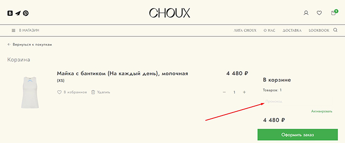 Выберите промокод для интернет-магазина Choux.ru, учитывая правила его активации. Они могут содержать ограничения на сумму заказа, категории товара или другие параметры. Скопировав промокод в буфер обмена на вашем устройстве, переходите на сайт магазина Чукс. Затем действуйте по порядку: