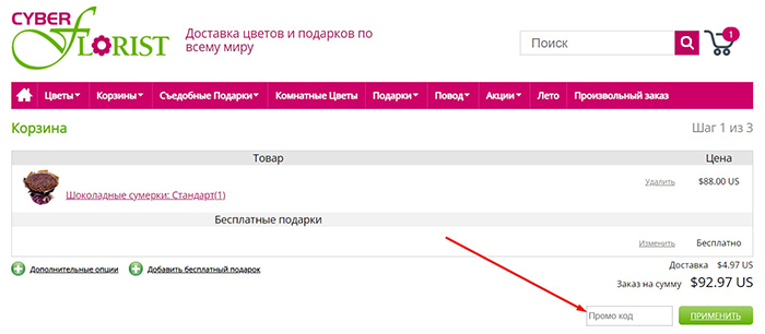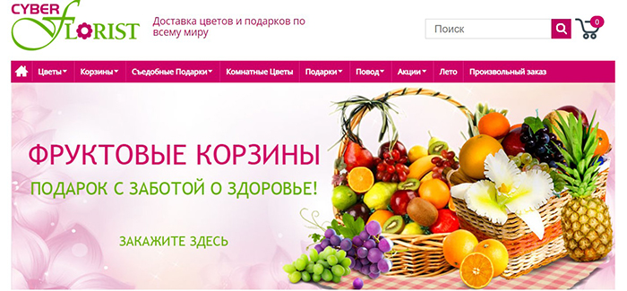 Сервис работает с 1997 года, и с его помощью можно заказать доставку не только в России, но и в другие страны мира, в том числе в США. Качество подтверждается фотоотчетами. Помимо удобства, покупки в интернет-магазине Cyber-florist.ru окажутся и максимально выгодными. Достаточно воспользоваться промокодом, и скидка у вас в кармане. На нашем ресурсе можно найти массу подходящих акций.