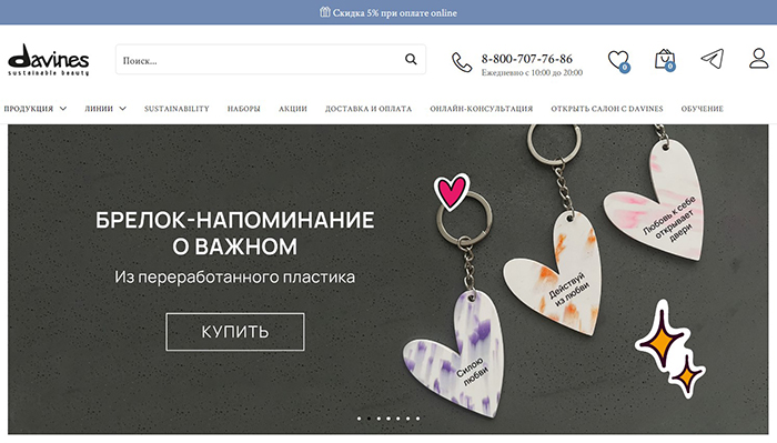 Давинес – итальянская косметика профессионального класса. Секрет ее популярности – в удачном сочетании целительных свойств природных компонентов и современных научных разработок. Компания придерживается принципов устойчивого развития и экологической ответственности: она не тестирует продукцию на животных, не использует токсичные и потенциально вредные компоненты, а некоторые позиции создает из переработанных материалов – например, брелоки и аксессуары. На сайте