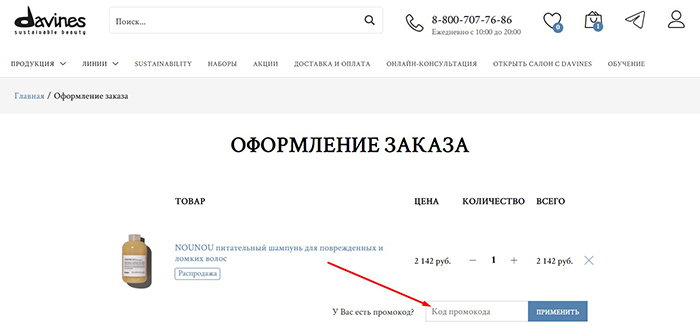 Для получения скидки по промокоду в магазине Давинес нужно: