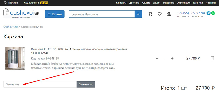 Один из весомых плюсов оформления заказа в интернет-магазине Dushevoi.ru – регулярные акции, распродажи, а также возможность применить промокод и получить скидку. Благодаря нашему ресурсу, вы будете в курсе самых свежих промо-предложений и не пропустите ни одного скидочного купона, а значит, каждая ваша покупка будет выгодной.
