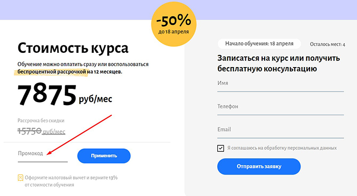 Если вы приблизительно понимаете, какое обучение вам необходимо для продвижения по карьерной лестнице, открывайте каталог курсов и выбирайте подходящую программу из доступных. Далее перейдите к конкретному курсу и кликните по кнопке «Записаться на курс». В открывшейся форме не забудьте обязательно указать промокод. Так вы получите скидку. Кроме того, потребуется ввести ваше имя, номер мобильного телефона и адрес электронной почты.