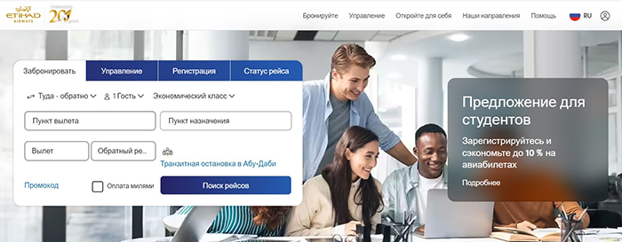 На сайте Etihad.com множество возможностей, которые позволяют оформить билет на желанный рейс на выгодных условиях. Расскажем о них подробнее: