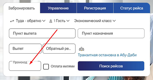 После этого можно отправляться на сайт Etihad.com. На главной странице есть удобная система подбора билета. Именно в этой форме можно ввести промокод, чтобы скидка подействовала на выбираемый рейс сразу же.