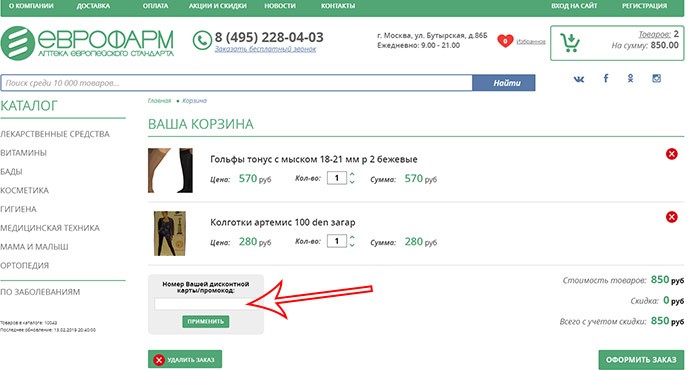 В форме предусмотрено поле, куда можно ввести или номер дисконтной карты, или промокод. Будь внимательна – среди акций, которые представлены на нашем сайте, имеется немало весьма выгодных специальных предложений. Скидка по ним окажется больше, чем скидка по дисконтной карте, если таковая у тебя имеется. Так как можно ввести только один код, выбирай наиболее выгодное предложение.