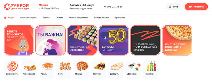 Многие любят вкусно поесть, но часто на готовку не хватает времени. Чтобы не отказывать себе в удовольствии и чаще баловать себя и домочадцев вкусными блюдами поход, можно заказать еду с доставкой. Сервис Фарфор предлагает пиццу, роллы, суши и другие блюда, приготовленные с любовью и неизменным качеством. Разнообразное меню легко оценить как на сайте, так и в удобном мобильном приложении.
