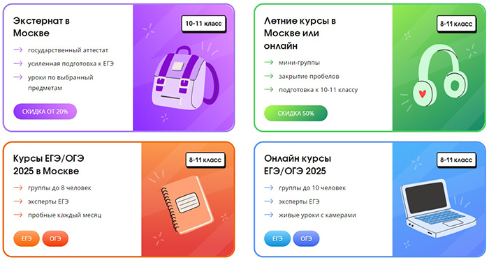 Еще один вид курсов – интенсивы ЕГЭ и ОГЭ. Они длятся всего 4 месяца. За этот период ученики успевают пройти все темы и решить все задания, которые будут на экзаменах, занимаясь дополнительно по два часа в день.