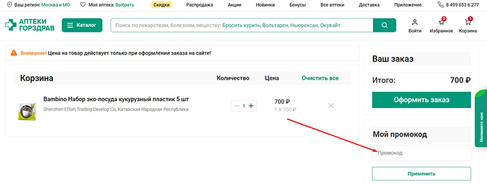 С помощью поиска по наименованию товара, действующему веществу или по диагнозу можно найти необходимые позиции в считаные мгновения. Кроме того, можно воспользоваться каталогом и просто перейти в подходящую категорию. Определившись со списком покупок, пора переходить к оформлению заказа. Для начала следует ввести промокод, чтобы получить скидку или бонус. После этого нужно определиться, какой вариант получения подходит больше: получение в аптеке или доставка курьером. Потребуется либо выбрать аптечный пункт для самовывоза, либо указать адресные данные.