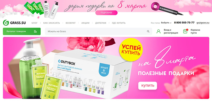 Грасс – компания, которая производит косметику, средства для профессиональной уборки, автомобильную химию. Команд Grass.su изучает передовые научные разработки, создает и использует собственные инновационные технологии для создания качественных, безопасных и доступных продуктов. На официальном сайте можно приобрести обширный перечень средств для мойки, чистки и восстановления, пятновыводителей, косметики по расценкам производителя. Дополнительная возможность сэкономить – промокоды, которые собраны на этой странице: с их помощью можно получить скидку до 500 рублей на покупку.