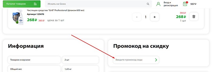 Если хотите получить желаемую скидку на товары из магазина Грасс, рекомендуем изучить правила использования промокодов. Каждый такой скидочный купон – уникальный набор символов, который нужно ввести при оформлении заказа на официальном сайте. Найти бесплатные предложения можно на нашем сайте.