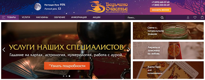 Кроме того, команда магазина оказывает магические услуги, предлагает консультации онлайн и офлайн. Также от ресурса действует Школа волшебных искусств, где можно обучаться у практикующих магов или посещать полезные вебинары.