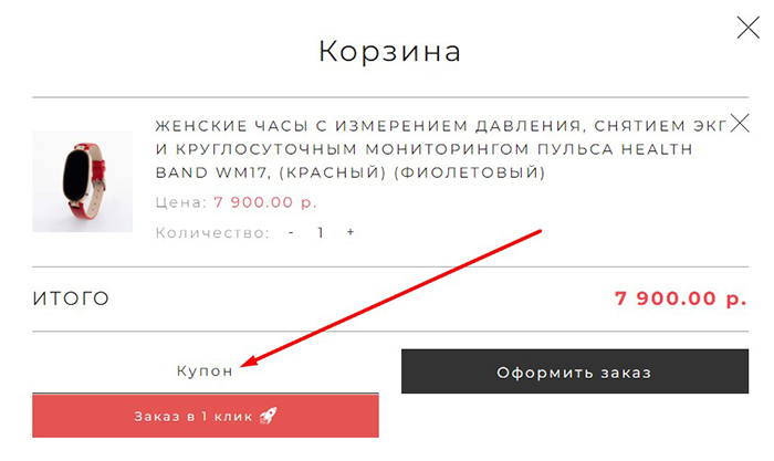 Воспользовавшись каталогом или поиском по сайту Healthband.net, сверив характеристики и определившись с моделью, останется только отправить подходящие часы или браслет здоровья в Корзину. Чтобы перейти к оформлению, нужно открыть Корзину в боковой панели. Именно там можно ввести промокод, чтобы получить дополнительную скидку. Далее останется подтвердить заказ. Для этого потребуется: