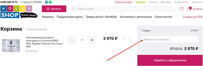 Воспользовавшись поиском по сайту или каталогом, можно подобрать нужные косметические средства и другие товары и заполнить Корзину. После этого пора переходить к оформлению. В первую очередь следует ввести промо-код, чтобы получить скидку.