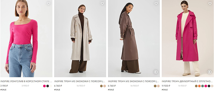 Инспайр любит яркие цвета, расслабленные силуэты и натуральные ткани. К качеству готовых изделий предъявляются строгие требования, поэтому цены – в пределах среднего ценового сегмента. Но если использовать промокоды, которые собраны на нашем сайте, получится намного выгоднее!
