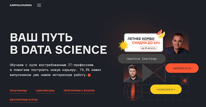 Информация об актуальных акциях публикуется на главной странице сайта Karpov.courses. Например, в летний период можно рассчитывать на скидку 10% на все курсы. Кроме того, обратите внимание на курсы, которые вы можете пройти абсолютно бесплатно: