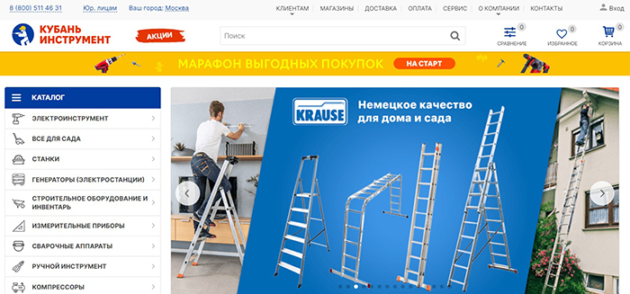 После того как вы откроете интернет-магазин Kubaninstrument.ru, можете сразу перейти к изучению каталога или воспользоваться поиском, чтобы подобрать подходящие товары. Если предварительно вы захотите сравнить несколько позиций, можно выбрать соответствующую опцию в верхней панели меню.