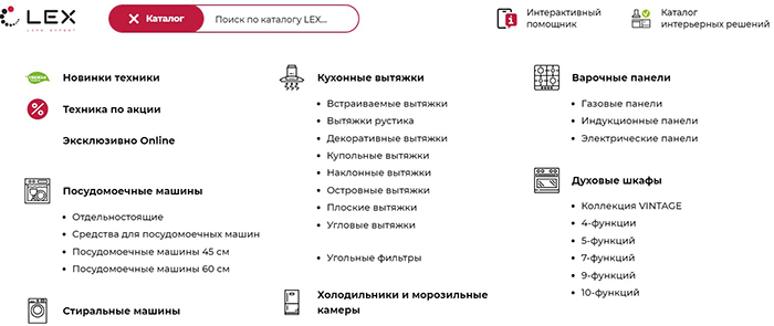 Изначально компания Лекс занималась производством кухонных вытяжек. В далеком 2005 году вытяжки выполняли сугубо функциональную роль: обеспечивали воздухообмен, необходимый на кухне. В дальнейшем ассортимент был расширен. Сейчас в интернет-магазине Lex1.ru можно приобрести: