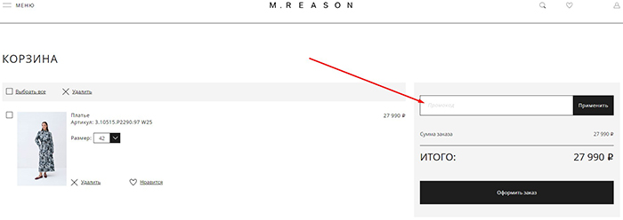 Для активации промокода регистрация на сайте M-reason.ru необязательна. Вам нужно выбрать купон из числа представленных на нашем сайте и скопировать символы в буфер обмена на вашем устройстве. После останется открыть в соседней вкладке интернет-магазин М Ризон и перейти к покупкам: