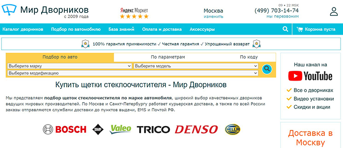 На сайте Mirdvornikov.ru вас ждет несколько вариантов подбора подходящего товара. Во-первых, можно обратиться к каталогу и найти там нужный вариант. Во-вторых, можно воспользоваться строкой поиска. Кроме того, очень удобно выбирать продукцию с помощью специальной формы, чтобы найти дворники по марке автомобиля, необходимым параметрам или кодировке. В каталоге также можно отсортировать предложения по брендам.