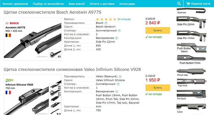 Автовладельцы могут подобрать на сайте подходящий вариант стеклоочистителя по марке автомобиля, типу крепления и длине, по коду. В каталоге представлены товары от разных производителей, так что найти подходящий вариант не составит труда. Также на сайте можно приобрести автохимию и разнообразные аксессуары.