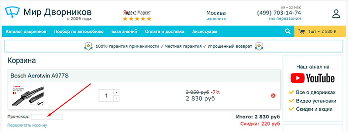 Сориентировавшись в ассортименте и подыскав нужный товар, останется добавить его в Корзину и продолжить оформление. В первую очередь следует ввести промокод. Поле для него расположено под списком покупки. Чтобы рассчиталась скидка, необходимо кликнуть по «Пересчитать Корзину».