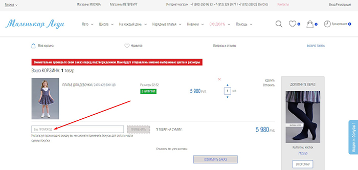 Удобный каталог поможет подобрать подходящую одежду для маленькой леди. Система фильтров позволит быстро найти желаемое. Останется только указать цвет и размер, после чего отправить товар в Корзину. Собрав все, что хочется купить, можно начинать оформлять покупку. Сначала рекомендуем ввести промокод, чтобы получить скидку на выбранные товары.