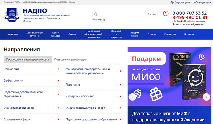 Образовательная площадка Nadpo.ru предлагает программы и курсы, направленные на повышение квалификации или профессиональную переподготовку. Здесь охвачены такие направления, как: