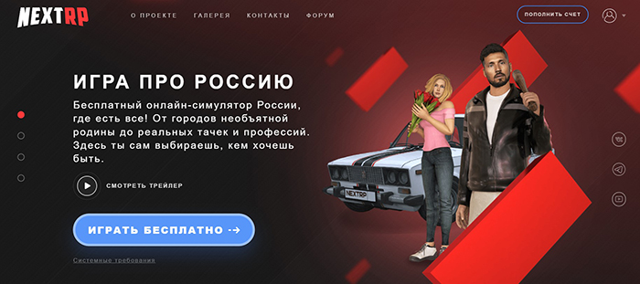 Игровой мир Nextrp.ru создан на основе реальной России. В нем есть Кремль, Арбат, парк Зарядье и другие московские достопримечательности. Игрок начинает старт с низов криминального мира, и пытается достичь его вершины, или напротив, выбирает роль милиционера, который хочет сделать карьеру и разобраться с преступным миром. Также можно быть таксистом, дальнобойщиком или выбрать одну из десятка других профессий.