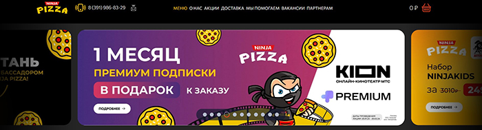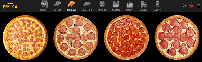 Сервис Ninjapizza.ru предлагает заказать свежие и вкусные блюда с доставкой. Меню находится на главной странице и разделено на категории. В ассортименте представлены: