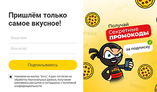 Новые покупатели, которые решили впервые воспользоваться сервисом Ninjapizza.ru, могут рассчитывать на специальную скидку по промокоду. Узнать секретную комбинацию можно, если заглянуть в окно интерактивного чата. Оператор предоставит нужную информацию. Важное условие одно – нужно сделать заказ на минимальную сумму, которая отмечена в условиях этой акции. Кроме того, каждый покупатель может получить секретный подарок от сервиса.