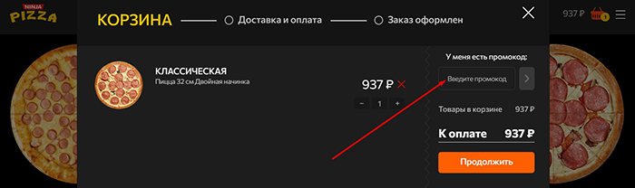 Когда хочется подобрать что-то вкусное или заказать достаточно пиццы для вечеринки с друзьями, достаточно открыть меню ресторана Ninjapizza.ru и выбрать подходящие позиции, например, набор или же отдельные блюда. Отправив в Корзину все, что понравилось, можно начинать оформление заказа. В первую очередь стоит ввести промокод. Это поможет получить скидку на заказ.