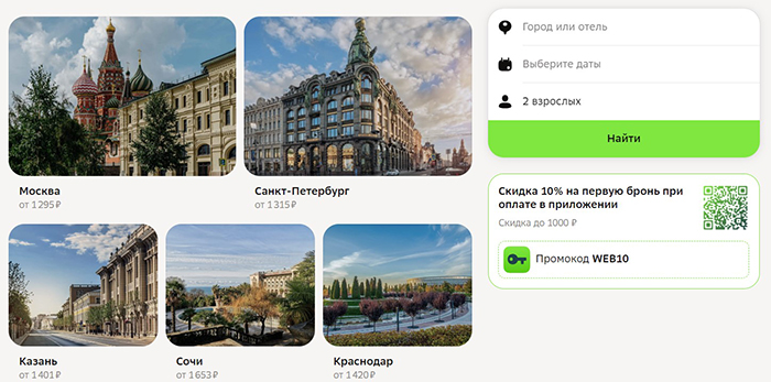 Выбирая, куда поехать, рекомендуем обратить внимание на главную страницу сайта-агрегатора. Там есть раздел с популярными направлениями, у каждого из которых указана минимальная цена размещения. Такой способ оценить свои финансовые возможности весьма удобен.