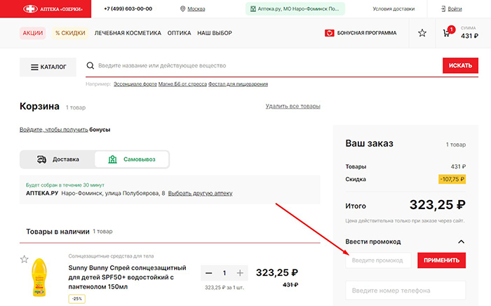Оформляя заказ, нужно внимательно изучить правый блок. Именно там следует указать номер телефона, если покупатель – участник Бонусной программы, и промокод, если хочется получить скидку. После этого достаточно выбрать подходящий вариант оплаты товара. Покупку можно полностью оплатить онлайн или же выбрать способ при получении. В аптечном пункте вы можете рассчитаться за заказ как наличными, так и банковской картой.