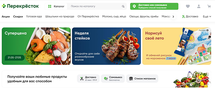 Перекресток – одна из крупнейших в России сетей супермаркетов. В настоящий момент у нее 961 магазин, расположенный по всей территории РФ. Воспользоваться услугами доставки можно через официальный сайт, а также фирменное мобильное приложение для iOS или Android.
