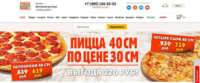 Получить скидку в Пицца Суши Вок очень просто, зачастую достаточно простой зайти на сайт и внимательно изучить информацию. Например, периодически на Pizzasushiwok.ru проходят распродажи определенных типов продукции. Вы можете заказать вкусные блюда по приятным ценам из раздела Sale, чтобы выгодно побаловать себя и родных.