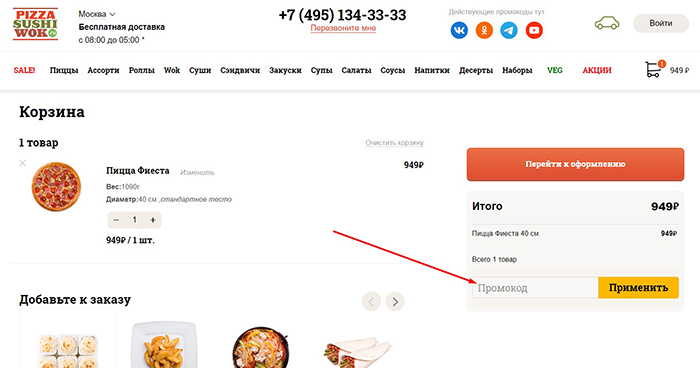 Второй вариант: сначала пробежаться по меню и собрать в Корзину все желаемые блюда. Сделать это легко: на главной странице Pizzasushiwok.ru представлен весь ассортимент в красочных и аппетитных картинках. Выберите нужное количество и переместите заказы в корзину. Далее кликайте на значок Корзины, проверяйте список и, не переходя к оформлению, введите промокод. Сумма покупки сразу будет пересчитана с учетом скидки. Если нет – проверьте правильность введенной комбинации, лучше скопировать ее прямо с сайта.