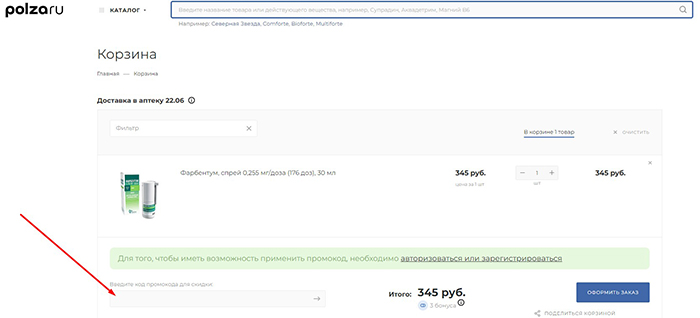 У сервиса Польза.ру часто бывают промокоды для новых покупателей. Они собраны в разделе «Акции»: загляните, чтобы проверить актуальность предложения. Правила просты: нужно оформить заказ на сумму не ниже минимальной (стоимость указана в условиях акции), и ввести промокод – за это компания предоставляет фиксированную скидку в 300-500 руб.