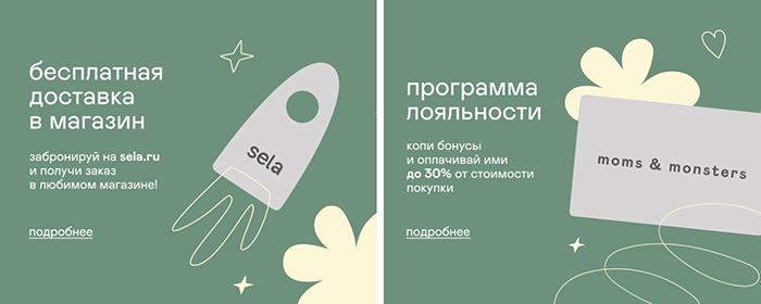 Села – это не только интернет-магазин, но и уютные розничные магазины. Они обустроены так, чтобы в них было удобно приходить всей семьей. У вас не возникнет сложностей с тем, чтобы закатить коляску в примерочную, или развлечь ребенка, пока взрослые делают покупки.