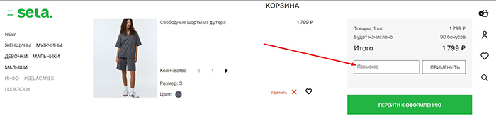 Для начала выберите промокод для интернет-магазина Sela.ru из числа тех, что представлены на нашем сайте. Все они актуальны и бесплатны. Символы промокода необходимо скопировать, после чего останется перейти на сайт или в фирменное мобильное приложение Села. Действуйте по такому алгоритму:
