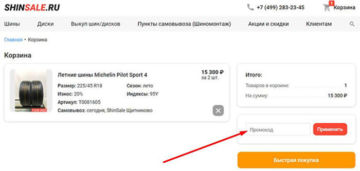 На открывшейся странице справа вы увидите информацию об общей стоимости покупки. Под финальной суммой находится поле для добавления скидочного купона. Не забудьте ввести скопированный на нашем сайте промо-код, чтобы получить скидку. После этого останется только кликнуть на кнопку «Быстрая покупка». Откроется новая форма, где нужно указать личную информацию, в том числе номер телефона. Менеджер компании в скором времени свяжется с вами, чтобы уточнить особенности доставки и подходящий для вас вариант оплаты.