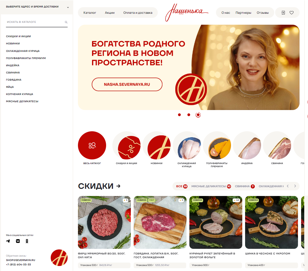 Nasha.severnaya.ru – это онлайн-магазин, предлагающий продукцию от одноименной птицефабрики, находящейся в РФ. Все производственные площадки расположены в Ленинградской области. Проверка готовой продукции, в том числе на отсутствие гормональных препаратов, ведется в аккредитованной независимой государственной лаборатории. Вся продукция реализуется по ценам птицефабрики, исключаются дополнительные надбавки поставщиков и торговых точек. Постоянные акционные предложения и дисконты позволяют значительно сэкономить и приобрести мясо кур по самым привлекательным ценам в регионе.