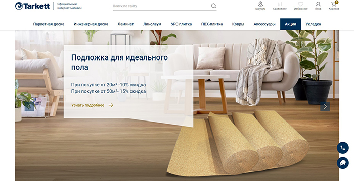 Таркетт предлагает специальную цену на первый заказ. Для получения дополнительных привилегий нужно указать адрес электронной почты во всплывающем окне. Размер скидки и условия ее получения компания обещает сообщить дополнительно.