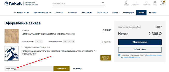 Чтобы использовать промокод при покупке в официальном интернет-магазине Таркетт, нужно выбрать один из купонов, опубликованных у нас на сайте. Внимательно прочтите описание и убедитесь, что условия активации вам подходят. Они могут касаться срока действия, минимальной суммы заказа, комплектации корзины и прочих критериев. Если условия подходят, необходимо скопировать символы в описании, а после этого:
